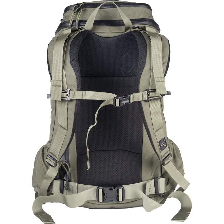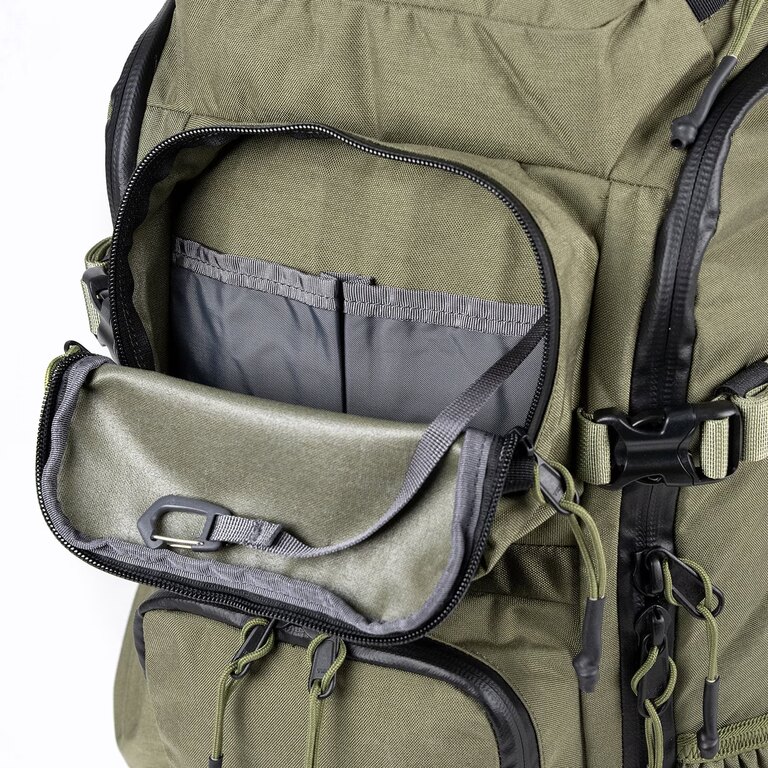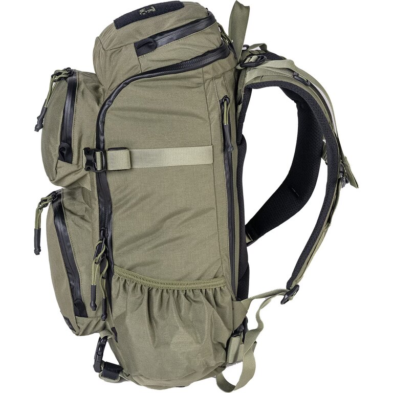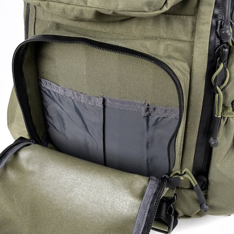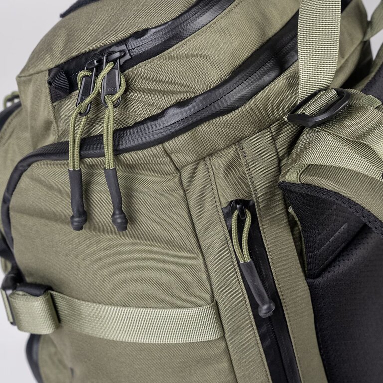 Vnitřní PALS panely umožňují uchycení dalšího vybavení podle aktuálního použití. Kompresní popruhy na bocích i spodní části fixují obsah blízko těla a pomáhají udržet stabilitu při pohybu, zatímco boční kapsy s odtokovými otvory si poradí i s vlhkým obsahem.