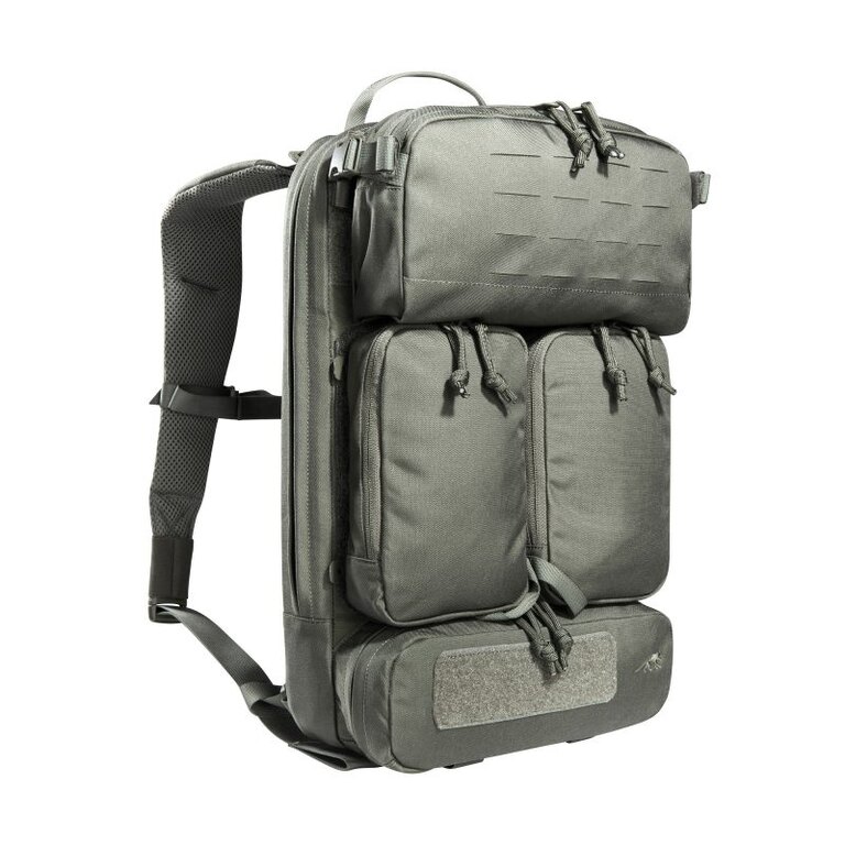 Na čelní straně batohu najdete čtyři samostatné vnější kapsy na zip. Prostřední dvě jsou oddělitelné a horní a spodní jsou pevné. Prostorná horní kapsa je na vnější straně vybavena laserem řezaným MOLLE systémem pro další modulární rozšíření. Pod ní jsou umístěny dvě identické středové kapsy. Jejich uchycení na panelu pomocí suchého zipu skýtá možnost je v případě potřeby pomocí prodlouženého poutka rychle odepnout. Jsou proto ideální pro vytvoření lékárničky, nebo vložení obsahu, který chcete mít snadno na dosah, případně jej jednoduše sdílet. Na podélné spodní kapse je umístěná velcro plocha pro umístění ID označení. Nízkoprofilová hlavní kapsa je přístupná dlouhým zipem po obvodu, který umožňuje vyklopení celého čelního panelu. V tomto prostoru najdete dvě ploché síťované kapsy na zip, vhodné pro uložení map, nebo dokumentů. Velká část vnitřního prostoru je pokryta velcro MOLLE systémem. Součástí batohu jsou také pouzdra na pistolové zásobníky, které můžete umístit dovnitř i vně batohu.