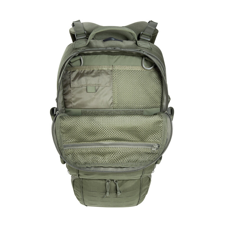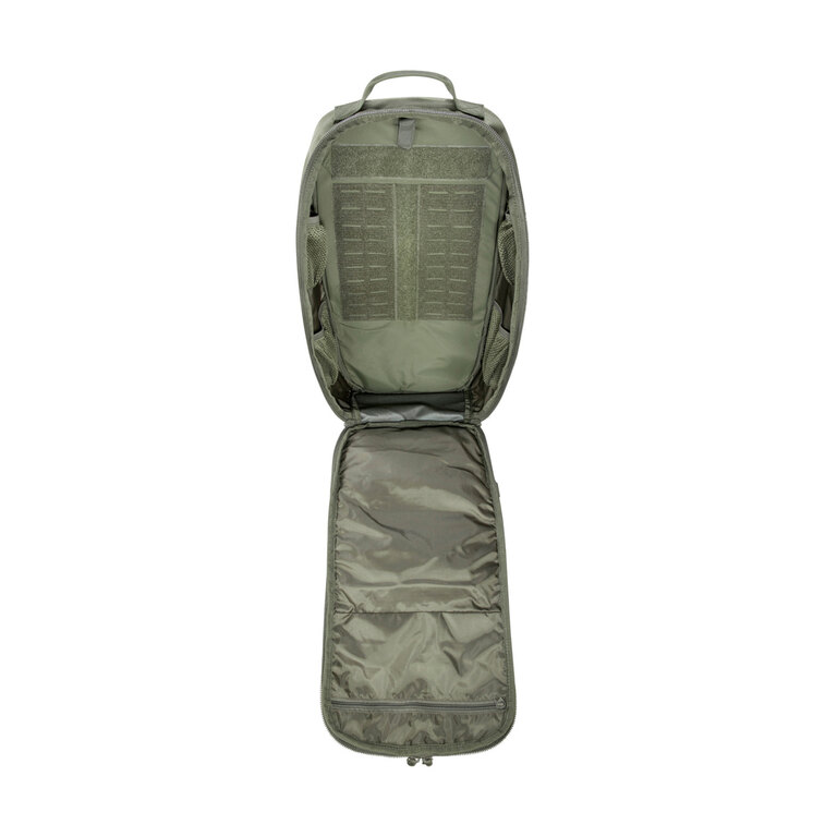 Velkorysá hlavní komora je vybavena vnitřními MOLLE panely na suchý zip pro individuální uspořádání vybavení. Tři přední kapsy s různými přihrádkami poskytují rychlý přístup k důležitým předmětům, přičemž spodní kapsa pojme až tři zásobníky. Ramenní popruhy jsou délkově nastavitelné, což umožňuje pohodlné nošení batohu i přes ochranné vesty.