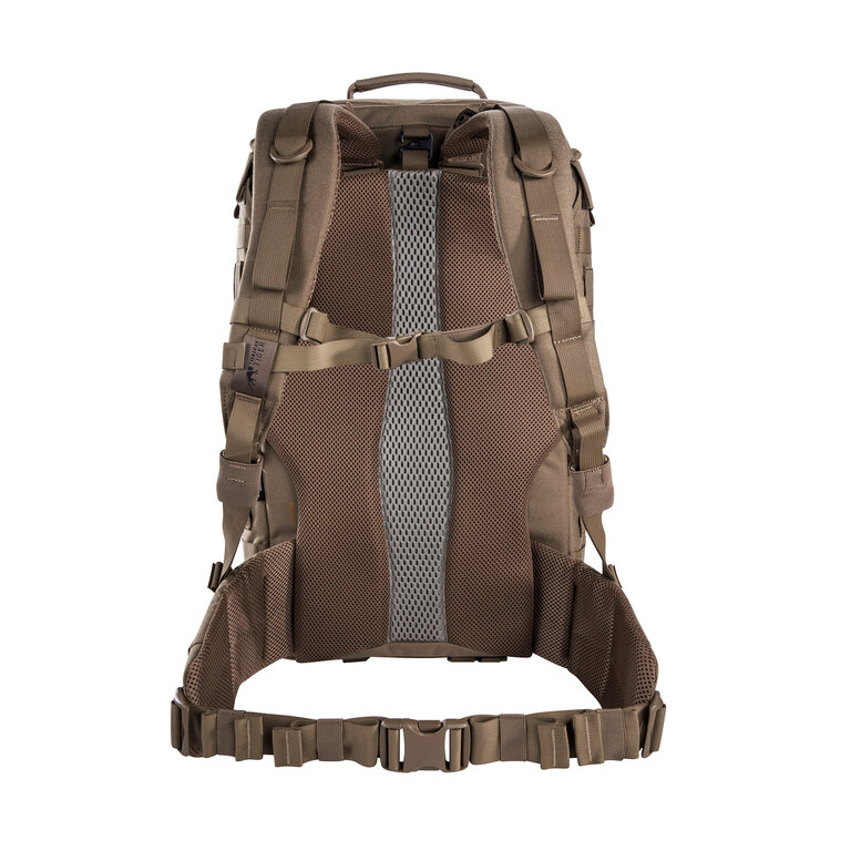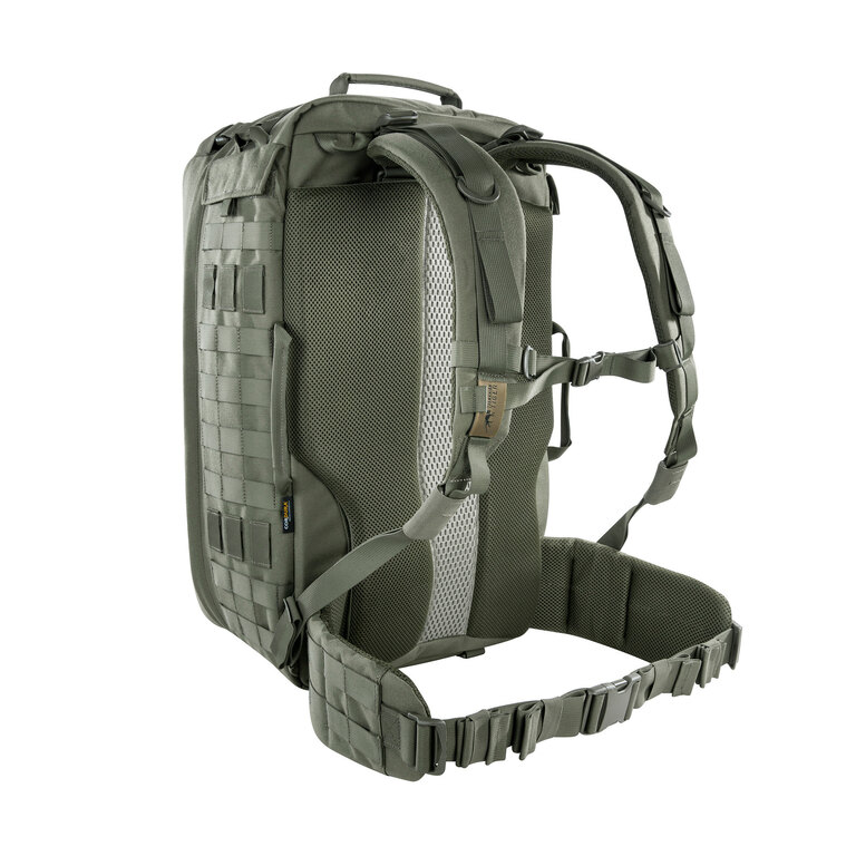 Polstrovaný zádový systém zajišťuje pohodlné nošení i při plném zatížení. Délkově nastavitelné ramenní popruhy umožňují použití i přes balistickou vestu. Nechybí ani boční madla pro manipulaci v omezeném prostoru.