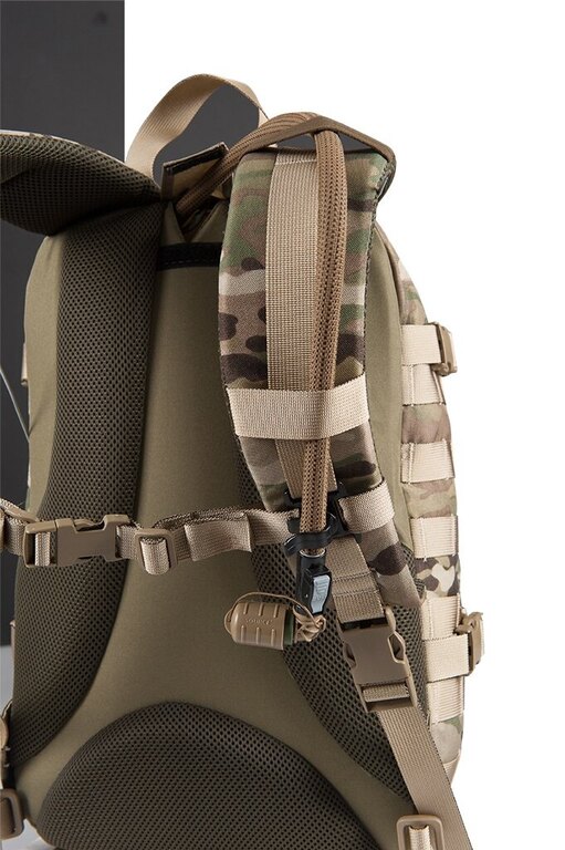 The backpack is MOLLE compatible, so it can be fitted with other MOLLE compatible equipment - pockets or cases, for example.It is possible to add Wisport Raccoon 9l or Wisport Sparrow 5l side pockets (sold separately) to the backpack, but you can also store a camelbag in it.