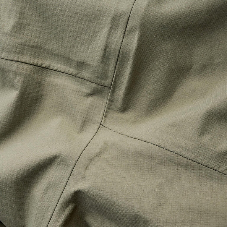 Odsazené švy zmenšují množství prošití, čímž snižují hmotnost a zvyšují životnost. Laminované lemy, manžety i kšilt kapuce zpevňují exponovaná místa a drží tvar i při častém používání. Dvoucestný voděodolný zip YKK Aquaguard a nastavitelný spodní lem chrání před počasím, ale neomezují pohyb.
