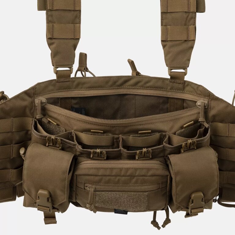 Boční panely jsou vybavené klasickým MOLLE/PALS systémem, takže si snadno rozšíříte kapacitu o další pouzdra, ať už nesete lékárničku, rádio nebo další munici. Uvnitř postroje navíc najdete velkou kapsu na zip – ideální na dokumenty, GPS nebo poznámkový blok. Na straně u těla pak nechybí ani ploché kapsy pro vysílačky, které zůstanou chráněné, ale zároveň rychle přístupné.
