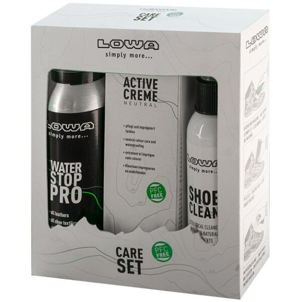 Čisticí sada na obuv Lowa Care Set Neutral sestává z následujících produktů: Water Stop Pro (125 ml), Active Creme Neutral (75 ml) a Shoe Clean (100 ml). Jedná se o sadu pro péči o obuv, která obsahuje vše potřebné k udržení vašich bot v optimální kondici. Kombinace výše uvedených produktů dohromady tvoří dokonalou ochranu pro vaše boty.