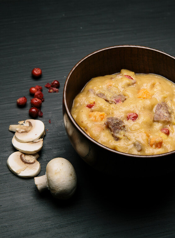 | Další specifikace | Složení: brambory, sobí maso (sobí maso 83 %), sůl, stabilizátor (E450, E451). (14 %), cibule, mrkev, pšeničná mouka, smetana (mléko) (7,5 %), řepkový olej, borůvky (6 %), houby (4 %), zvěřinový vývar (kvasničný extrakt, sobí maso, sůl, hovězí extrakt, maltodextrin, řepkový olej, cibule, koření), rajčatový koncentrát, koření, antioxidant (kyselina askorbová). |