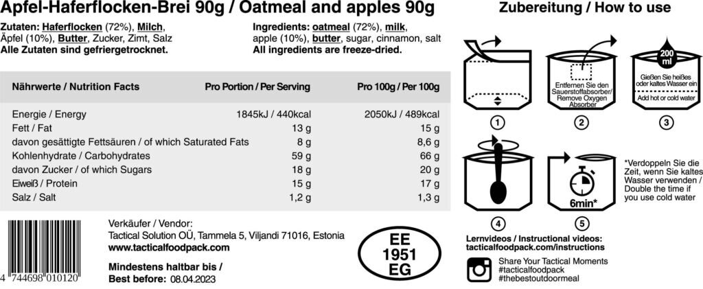 Chutná a výživná snídaně s 82 % másla pro vyšší výživovou hodnotu a s čerstvými jablky (10 %) pro šťavnatost a svěžest. Je 100% přírodní, bez konzervačních přísad. S horkou vodou je připravena za 6 minut, se studenou vodou je připravena za 12 minut. Energetický obsah na porci činí 440 kcal.