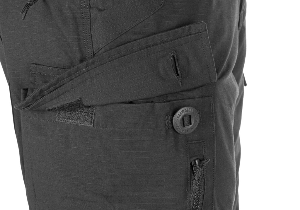 Kalhoty mají 2 úložné stehenní kapsy kryté klopou zapínanou na suchý zip vzadu a na 1 knoflík vpředu. Kapsy jsou hluboké a rozšířené směrem dopředu, takže vzniká dostatek prostoru pro uložení výbavy. Na dně mají kapsy drenážní otvor na odvod vnitřní zkondenzované vlhkosti. Kapsy jsou zdvojeny druhou, našitou kapsou se svislým vstupem zapínaným na zip. Ty umožňují snadný přístup i v sedě ve vozidle nebo v dřepu. Táhla zipů jsou osazena šňůrkou, která zajišťuje zapnutý zip provlečením přes knoflík stehenní kapsy. Úložný prostor byl také rozšířen o přihrádky s horním otevřeným vstupem, které jsou primárně určeny na uložení 30ti raného zásobníku s možností velmi rychlého přístupu. Kapsa je dostatečně hluboká a tak se nemusíte obávat vypadnutí zásobníku ani při rychlejších pohybech. Tuto tunelovou kapsu lze použít také například na uložení čepice, baretu a podobně.