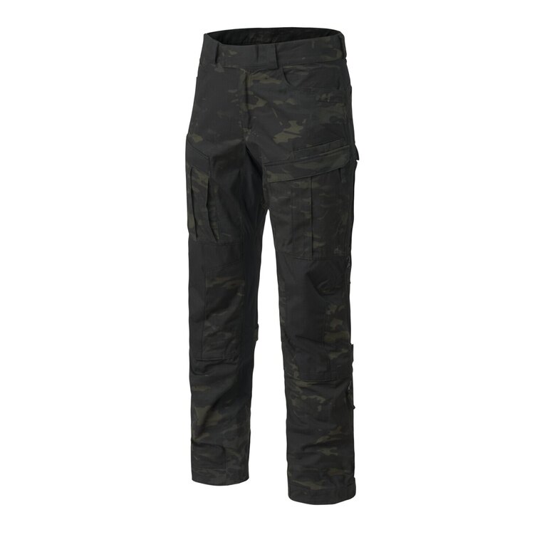 Základem těchto bojových kalhot je materiál NyCo Ripstop s kamuflážním vzorem Multicam. Tento materiál je tvořený z poloviny bavlnou a z poloviny nylonem a má přirozeně ripstop úpravu, díky které je odolnější vůči protržení. A když už trhlina přece jen vznikne, díky této úpravě se nešíří dál. Oblast kolen je navíc zesílena tkaninou Cordura 500D s otvory pro ochranné vložky.