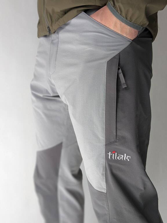 Odlehčený elastický materiál se zvýšenou odolností pochází z Rakouska, konkrétně od tamní firmy Getzner. Větší část směsi tvoří polyamid (z toho menšinu varianta Cordura), doplněná o elastan pro pohodlnější střih. Navíc je použité řešení odolné vůči větru, rychleschnoucí a současně výborně prodyšné. Výroba samotných kalhot pak stejně jako u dalších produktů Tilak probíhá v Česku.