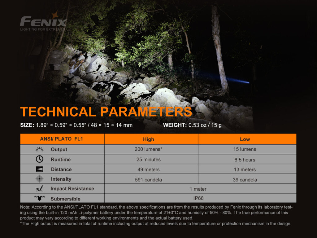 Měřeno dle standardu ANSI FL 1 v laboratorních podmínkách, za použití integrovaného dobíjecího Lithium polymerového akumulátoru 120 mAh, při teplotě 21 °C (+/- 3 °C) a vlhkosti 50 % až 80 %. Hodnoty se mohou lišit v závislosti na okolních podmínkách nebo na způsobu použití svítilny.