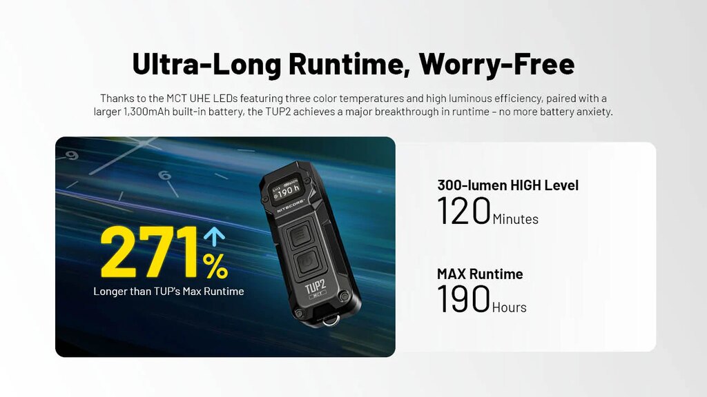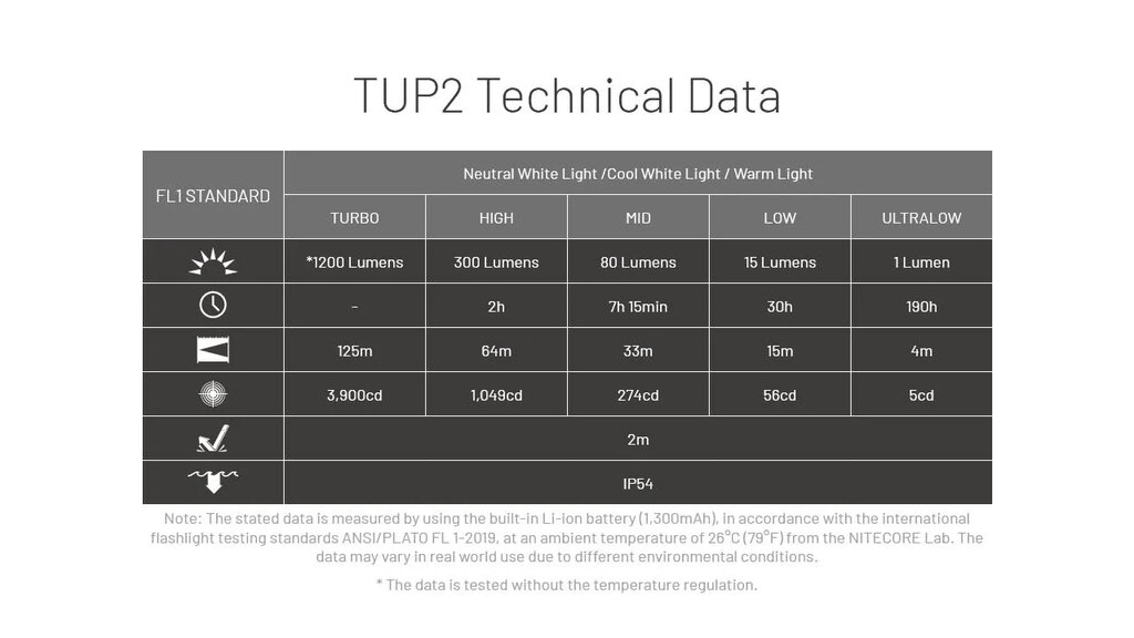 Nitecore TUP2 nabízí širokou škálu jasů, od jemného světla pro orientaci po extrémně silný záblesk. Díky efektivnímu řízení výkonu zvládá dlouhé hodiny provozu a drží stabilní svit v celém průběhu. Stačí si vybrat režim a světlo se postará o zbytek.