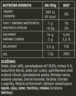 Cizrna jako hlavní surovina dodává přirozený zdroj bílkovin a vlákniny, které udrží tělo v tempu po celý den. Zelenina přidává vitamíny a minerály, omáčka zase plnou chuť a vůni, která se neztratí ani po ohřevu. Výsledkem je sytá kombinace, která zasytí, ale nezatíží.
