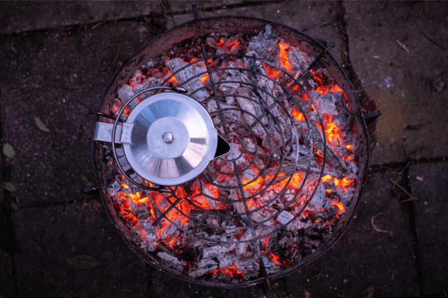 Někdo to rád horké a rozdělá si oheň. V tom případě si můžete vodu ohřát v hrnci, ešusu, nebo ještě lépe v kempingové konvici. Můžete vyzkoušet také speciální nerezový hrnek vhodný pro vaření na ohni – jen pozor na nerezové hrnky s plastovou rukojetí, ty se na oheň nehodí.