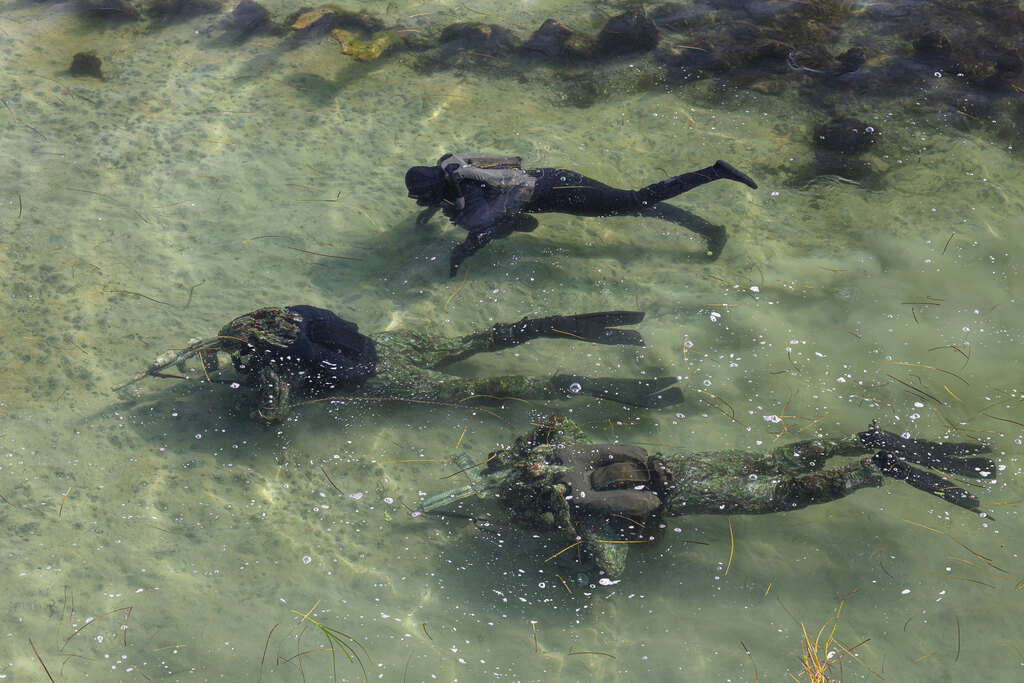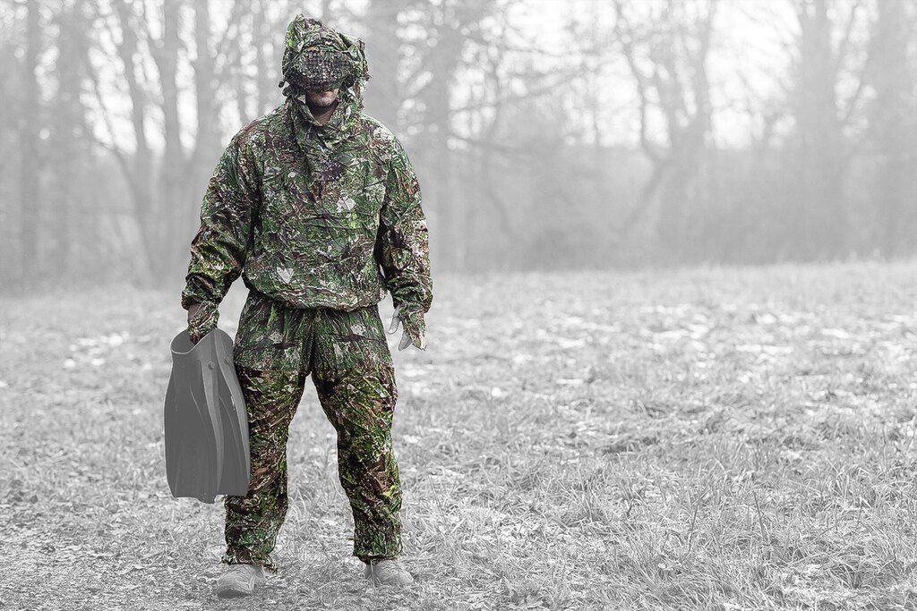 Maskovací oblek DIVER CAMO má výztuž Cordura na loktech i kolenou i kamufláž pro hřbety rukou. Dodává se včetně krytu potápěčské masky. Oblek se používá přes mokré i suché oblečení.