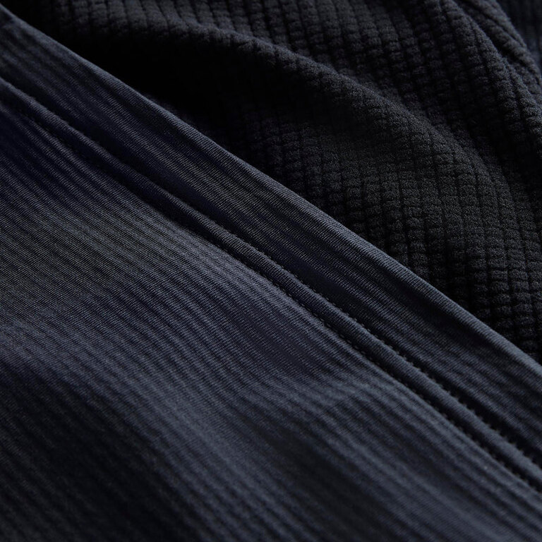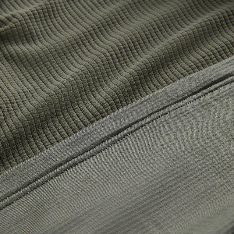 Pružná směs recyklovaného polyesteru a elastanu zajišťuje naprostou volnost pohybu. Mikina je ušitá plochými Flatlocked švy, které netlačí ani při nošení s batohem. Technický střih drží tvar a nevyhrnuje se, ani když se ruce zvednou vysoko nad hlavu.
