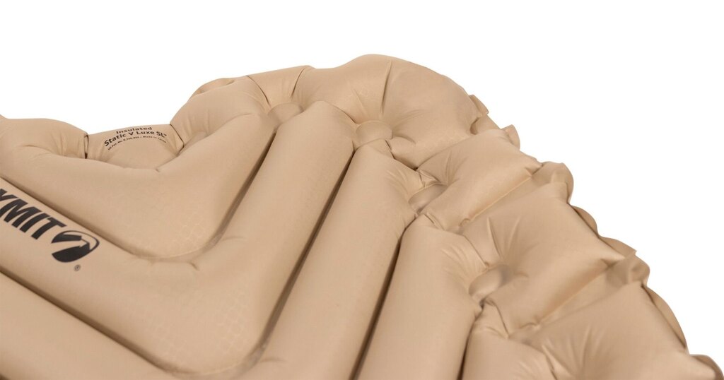 Klymit Insulated Static V luxe SL je jednou z nejdelších nafukovacích karimatek této značky. Po nafouknutí z ní vytvoříte lůžko dostatečně prostorné i pro téměř dvoumetrovou postavu. Uvnitř matrace je syntetická izolace Klymalite, která zvyšuje tepelný komfort tím, že zpomaluje přenos chladného vzduchu od země. Protože je tento materiál lehký a stlačitelný, na hmotnosti karimatky a velikosti po sbalení se to nijak výrazně neprojevilo. Díky izolačním vlastnostem je vhodná pro použití i v zimním období. Pro tuto modelovou řadu jsou typické vzduchové komory ve tvaru písmene V. Žebrování vede tělo v poloze na zádech, boku i na břiše a stará se o rovnoměrné rozložení vzduchu v komorách matrace. Při převalování během spánku nedochází ke slehnutí některé části karimatky. Další obvodové polštářky udržují spacák v ideální poloze a brání sklouznutí mimo karimatku. Materiál je měkký, nevrže při pohybu a je odolný vůči poškození.