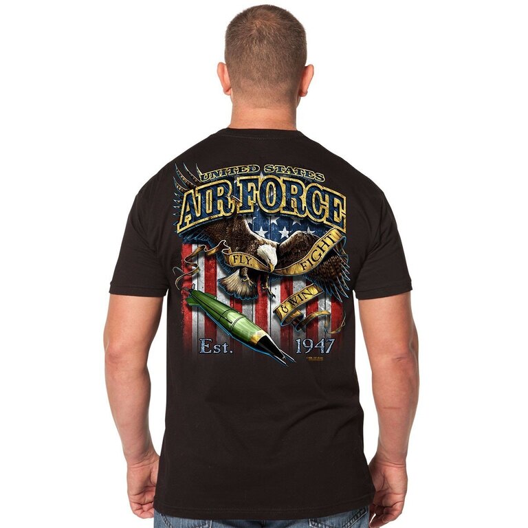 Toto tričko nemá žádnou konkurenci, vše je originál, potisk je považován za umělecké dílo a je chráněn autorskými právy (copyright ©). Výrazný potisk trička vpředu i vzadu je navržen a vytištěn v USA a je proveden nejmodernější dostupnou technologií, inkousty na vodní bázi změkčenými plastisolem (suspenze PVC s přidanými plastifikátory). Vlevo na hrudi malý nápis UNITED STATES AIR FORCE s motivem FLY, FIGHT & WIN a vzadu stejný nápis a motiv ve velkém.