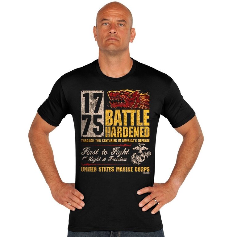 Toto tričko nemá žádnou konkurenci, vše je originál, potisk je považován za umělecké dílo a je chráněn autorskými právy (copyright ©). Výrazný potisk trička vpředu i vzadu je navržen a vytištěn v USA a je proveden nejmodernější dostupnou technologií, inkousty na vodní bázi změkčenými plastisolem (suspenze PVC s přidanými plastifikátory). Vpředu na hrudi nápis / motiv BATTLE HARDENED THROUGH TWO CENTURIES IN AMERICA´S DEFENCE (zoceleni bojem na obranu Ameriky v průběhu dvou století) UNITED STATES MARINE CORPS s logem USMC a vzadu nahoře malý nápis BATTLE HARDENED UNITED STATES MARINE CORPS s logem USMC.