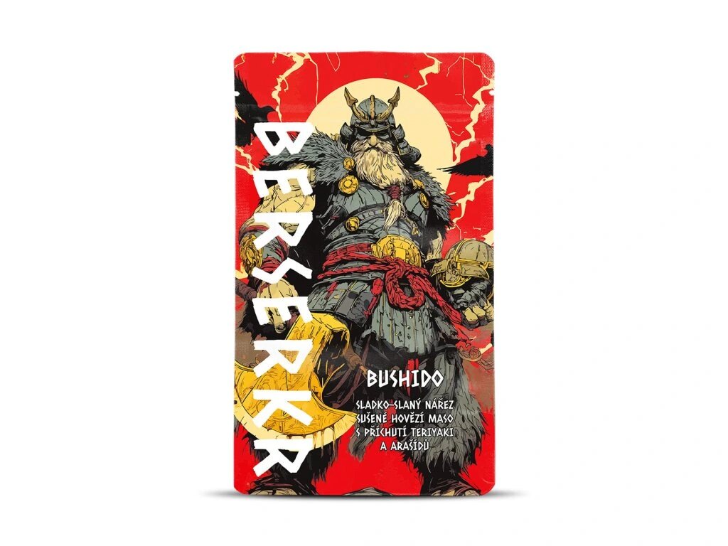 BUSHIDO Teriyaki & arašídy Berserker® je sušené hovězí maso (beef jerky) s výraznou sladko-slanou chutí inspirovanou japonskou kuchyní. Kombinace teriyaki marinády a jemného nádechu arašídů vytváří vyváženou chuť, která zvýrazňuje přirozený charakter hovězího masa a dodává mu lehce orientální tón. Díky způsobu zpracování je sušené maso praktickým a skladným snackem vhodným na cesty, do přírody i jako rychlá svačina během dne.