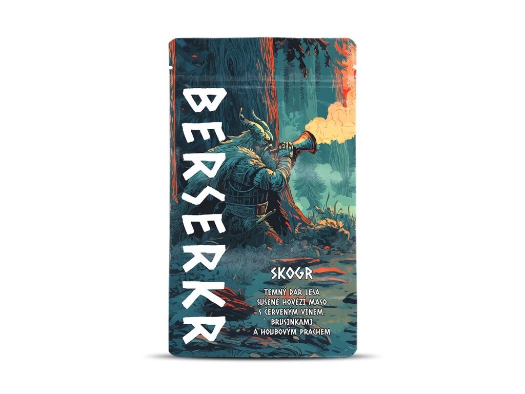 SKOGR Lesní směs koření Berserker® je sušené hovězí maso (beef jerky) inspirované chutěmi lesa a přírodními surovinami. Kombinuje plnou chuť hovězího masa s jemně sladkokyselým tónem brusinek, zemitostí hub a lehkým nádechem červeného vína. Výsledkem je výrazná, ale vyvážená chuť, která se postupně rozvíjí a zachovává přirozený charakter masa. Sušené maso je díky způsobu zpracování praktickou a skladnou svačinou vhodnou na cesty, do přírody i jako rychlé doplnění energie během aktivního dne.