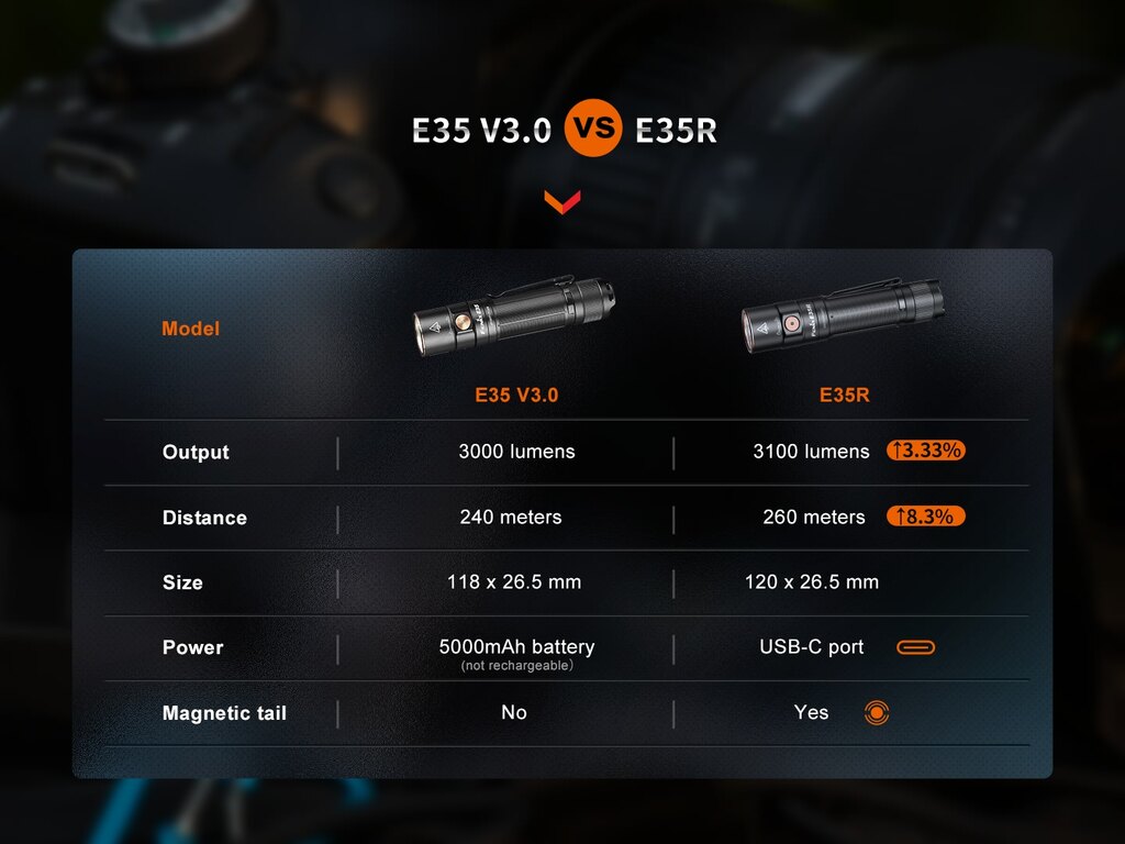 Fenix E35R je nabíjecí kapesní svítilna s nadstandardním světelným tokem i vysokým dosvitem. Hodí se jak pro profesionální použití – například členy bezpečnostních agentur nebo hlídači – tak pro nadšence do outdoorových aktivit a sportovce, kteří se venku pohybují v noci. Stejně tak se však může jednat i o nadstandardní svítilnu do dílny.