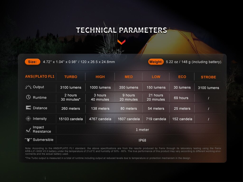 Měřeno dle standardu ANSI FL 1 v laboratorních podmínkách, za použití nabíjecího lithium iontového akumulátoru Fenix® ARB-L21-5000 V2.0 (21700 5 000 mAh), při teplotě 21 °C (+/- 3 °C) a vlhkosti 50 % až 80 %. Hodnoty se mohou lišit v závislosti na okolních podmínkách, způsobu použití svítilny nebo při použití jiných baterií.