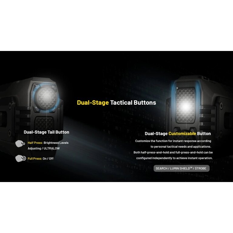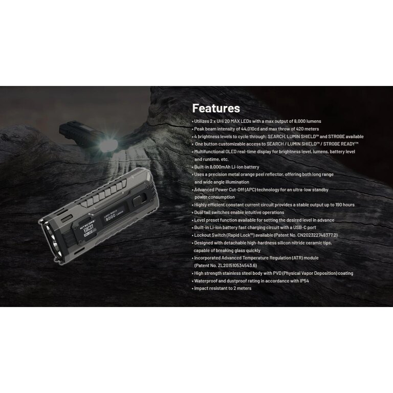 | Další specifikace | Vlajková loď Nitecore® pro rok 2025 Počet LED: 2 bílé Typ LED: 2× Dual NiteLab® UHi 20® Max - 2× UHi 20® + 2× 8 pomocných jader (UHi 20® - speciálně vyvinuté LED nové éry, v porovnání s běžně dostupnými LED jsou o cca o 41 % menší (2,26 mm²) a mají o cca 43 % větší světelnou hustotu (876 lm / mm²)) Přesný kovový texturovaný reflektor (orange peel reflector) nabízí dlouhý dosvit a širokoúhlé osvětlení Světelný kužel: bodový / úzký paprsek (primární LED jádro) i rozptyl (pomocná LED jádra) --- Ovládání: 2 taktická tlačítka na konci svítilny Dostupné režimy: bílé světlo různé intenzity - 4 + 3 speciální módy - taktický stroboskop, Search a Lumin Shield™ Lumin Shield™ - vytvoří světelnou zeď podobnou štítu pro velmi účinnou osobní obranu Stroboskop 2. generace - zapnutí/vypnutí 1 rukou, náhodné střídání frekvence v rozsahu 16 Hz až 20 Hz - silnější oslňující efekt Možnost přednastavení úrovně výkonu Rychlé dobíjení prostřednictvím portu typu UB-C přímo na svítilně Inteligentní rychlé nabíjení s výkonem 18 W, plné nabití za 2 h, k nabití použijte nabíječku nebo powerbanku, která podporuje protokoly rychlého nabíjení PD/QC OLED display zobrazuje v reálném čase zvolený režim, zbývající dobu svitu na daný režim, režim uzamknutí, stav baterie a indikátor dobíjení Funkce uzamknutí ve 2 režimech: režim 1 - uzamčeno pouze tlačítko On / Off (tlačítko Tactical zůstává k dispozici pro rychlý přístup k režimům Lumin Shield™, Search a Stroboskop) a režim 2 - uzamčena obě tlačítka (ideální pro přepravu svítilny) Rapid Lock™ - rychlé uzamknutí svítilny pomocí posuvníku na straně (patent č. CN202322748377.2) Klip pro nošení v kapse nebo na opasku, možnost připnutí jisticí šňůry (součástí dodávky) Unikátní protiskluzový povrch (čeká na patentování EU i US, patent č. CN2024206649950) pro jistý a bezpečný úchop holou rukou i v rukavicích Velmi tvrdé keramické hroty na rozbíjení skla vpředu --- Vysoce účinný obvod se stálým proudem poskytuje stabilní výkon Technologie APC (Advanced Power Cut-Off) pro extrémně nízkou spotřebu energie v pohotovostním režimu Pokročilá regulace teploty - ATR (Advanced Temperature Regulation) (patent č. ZL201510534543.6) Nový systém mřížky pro odvod tepla vyvažuje pěkný vzhled a praktické využití - poskytuje efektivní a rozsáhlý odvod tepla, udržuje vysoký výkon bez přehřívání a pohodlné držení v ruce --- Maximální doba svitu: 190 h Maximální svítivost: 44 010 cd Krytí: IP54 (ochrana před usazeným prachem, vydrží běžný déšť) Nárazuvzdornost: do 2 m |