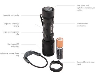| Součástí dodávky | Svítilna Standardní plochá fazeta a úderná fazeta 1x AA (tužka) baterie Duracell® Jisticí šňůrka |