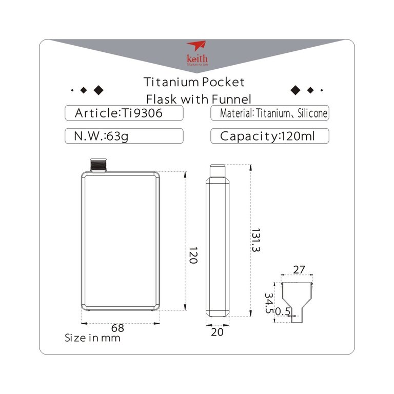 Keith Titanium není žádný nováček. Už od roku 2001 vyrábí ultralehké a spolehlivé vybavení z titanu. Tahle placatka není výjimkou. Firma vsadila na čistý materiál, precizní zpracování a konstrukci bez zbytečností. A výsledek? Záležitost, na kterou se dá spolehnout, kamkoli jdete.