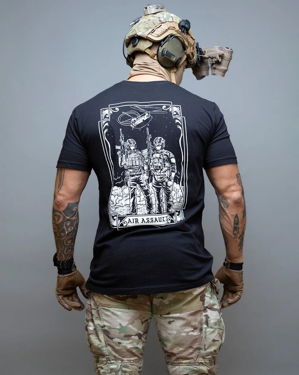 Design trička Air Assault představuje nizozemského a německého výsadkáře, symbolizující mezinárodní bratrství a odvahu výsadkových jednotek. Tento motiv vznikl ve spolupráci s @the__trace, což zajišťuje autentičnost a respekt k těm, kteří slouží.