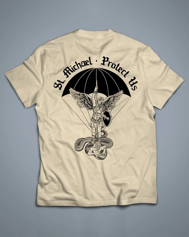 Archanděl Michael – ochránce, válečník, štít proti všemu zlému. Jeho podoba na tomto tričku není ozdobou, ale poselstvím. Každý detail designu připomíná sílu, odvahu a připravenost postavit se temným silám čelem – a nezlomit se.