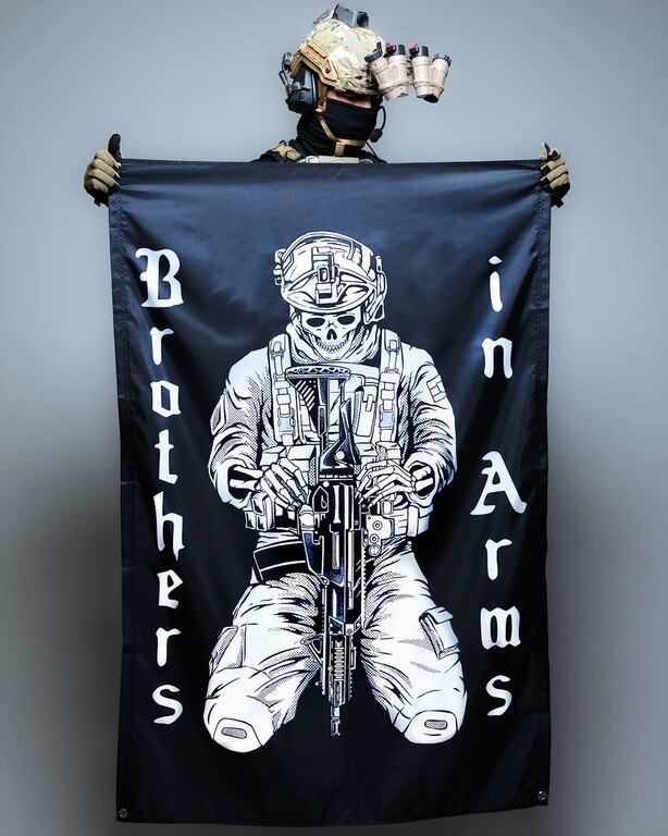 Vlajka Brothers in Arms je symbolem neochvějné loajality, jednoty a odvahy. S rozměry 1 m × 1,5 m a čtyřmi robustními kovovými oky je připravena stát se dominantou vašeho prostoru, ať už doma, v klubovně nebo na základně.