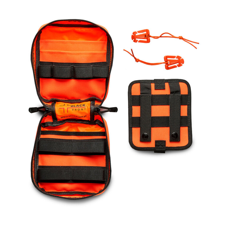 | Součástí dodávky | Pouzdro PTR Gumová nášivka s křížem 2× upínací popruh --- 4× jednorázové rukavice, nitrilové 1× dýchací rouška/resuscitační maska pro KPR s filtrem 1× obvazová síťka č. 3, délka 1 m 1× obvazová síťka č. 6, délka 1 m 1× pásky na uzavření ran 3 mm × 75 mm (blistr) 1× pásky na uzavření ran 12 mm × 100 mm (blistr) 2× trojcípý šátek z netkané textilie 2× elastické obinadlo 12 cm × 4 m 2× pletená čelenka 10 cm × 4 m 1× sterilní gázové obvazy 1 m² 4× sterilní gázový obvaz 10 cm × 10 cm 1× nouzová izotermická fólie/deka 1× taktické škrtidlo Black Front® 1× černé standardní záchranářské nůžky 1× permanentní popisovač 1× chemické světlo 1× kladívko na rozbíjení skla s řezákem bezpečnostních pásů |