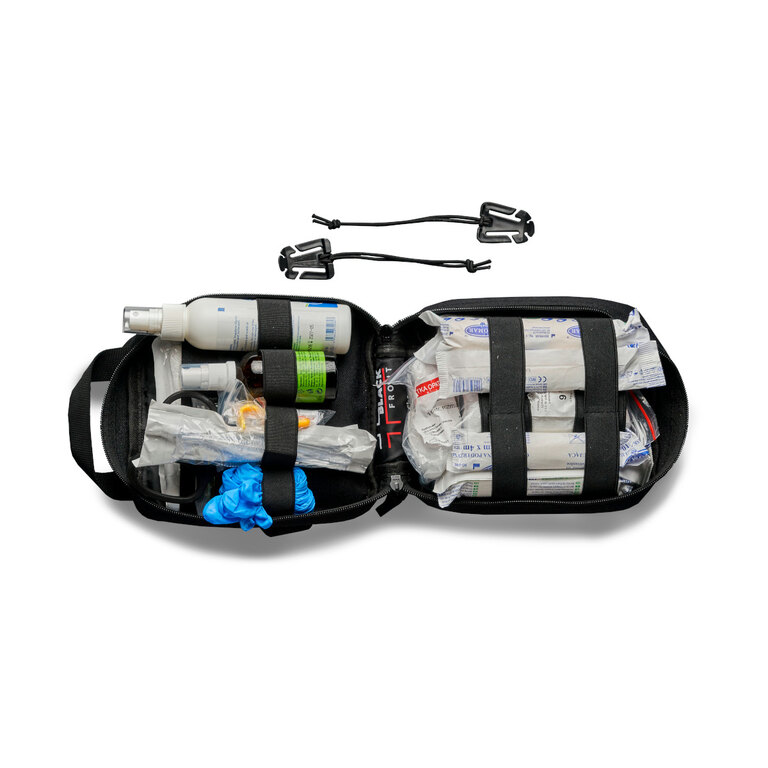 Uvnitř najdete síťované kapsy a gumové úchyty, které umožňují přesné rozvržení obsahu. Díky tomu okamžitě víte, kde co je – a hlavně se k tomu dostanete jednou rukou. V krizové chvíli tak šetříte čas i nervy.