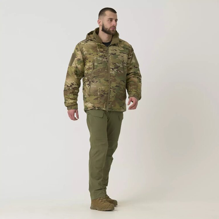 Uvnitř je syntetická izolace Climashield Apex, silnější než u běžných modelů Helikon-Tex. Nabízí maximální tepelný komfort i při promáčení, takže funguje i v dešti nebo sněhu. Vnější ripstop nylon odolá větru i lehké vlhkosti, zároveň zůstává prodyšný – a to je ideální kombinace pro dlouhé nasazení v terénu.